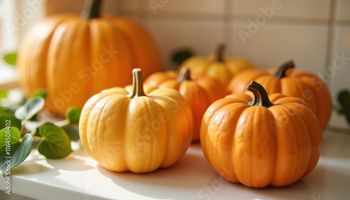 Warm autumn harvest of vibrant pumpkins showcasing rustic charm in a sunlit kitchen