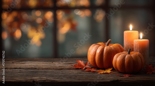 Warm autumn pumpkins with glowing candles create cozy atmosphere on rustic wooden table, surrounded by colorful fall leaves. soft light enhances seasonal charm
