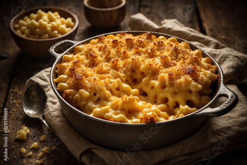 Warm baked Mac & Cheese: golden crust, gooey cheese, spoon lifting creamy portion; rustic wood background, side lighting