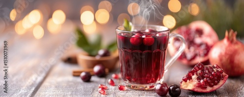 Warm beverage in a glass cup with pomegranate and berries, surrounded by a festive backdrop.
