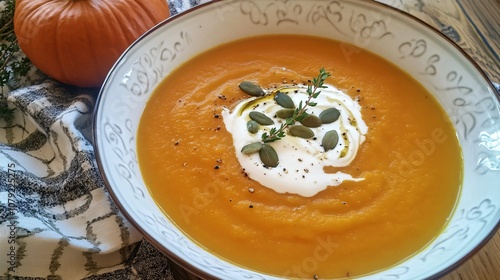Warm bowl of pumpkin soup with a garnish of pumpkin seeds, a swirl of cream, and thyme on a rustic wooden table setting