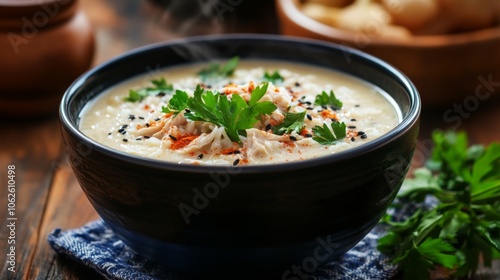 soup, bowl, rice, steaming, hot, garnish, herb, vegetable, meal, cookery, comfort, food, dinner, lunch, tasty, delicious, culinary, fresh, ingredient, broth, creamy, chicken, seasoning, parsley, pepper, black, spicey, warm, harvest, wooden, rustic, cosy, table, traditional, savoury, receipe, snack, alimentary, satisfying, epicure, eating, appetising, classic, cooking, dish, home, wholesome