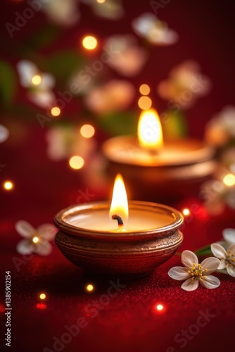 Warm Candlelight Glows on a Festive Red Surface with Delicate White Blossoms and Bokeh Lights Creating a Serene Ambiance