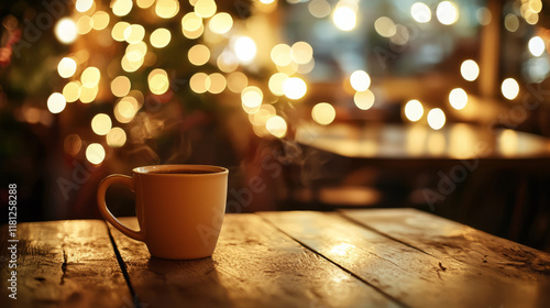 Warm coffee cup on rustic wooden table in cozy illuminated cafe