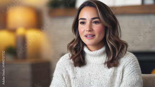 woman, conversation, cosy, room, sweater, wavy, hair, engagement, warmth, home, dialogue, indoor, lighting, expression, comfort, sitting, lifestyle, serene, connection, softness, intimate, candid, atmosphere, relaxed, personal, tranquil, modern, furniture, chat, smiling, calm, setting, natural, interaction, friendliness, personality, casual attire, tone, ambience, thoughtfully, approach, cosiness, gathering, homelike, inviting