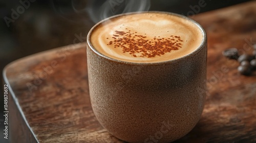 Warm cup of frothy coffee with cinnamon topping on wooden table in cozy cafe