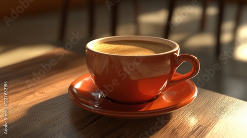 Warm espresso cup on a wooden cafe table reflecting morning sunlight creating a cozy atmosphere for relaxation and enjoyment.