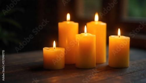 Warm Glow of Beeswax Candles A Close-Up of Variously Sized Candles Casting a Soft, Inviting Light on Dark Wood, Perfect for Spiritual, Religious, or Home Decor Settings.