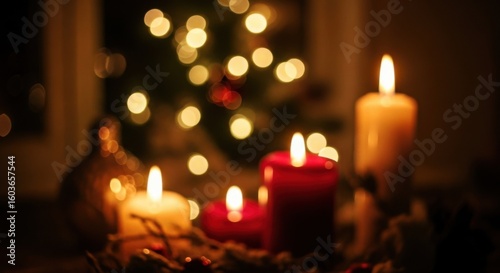 Warm Glow of Christmas Candles and Festive Lights Creates Cozy Holiday Atmosphere
