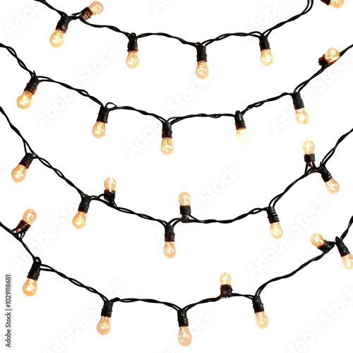Warm glowing string lights with vintage-style bulbs isolated on white background, perfect for outdoor patios, weddings, or festive indoor settings to create a cozy ambiance.