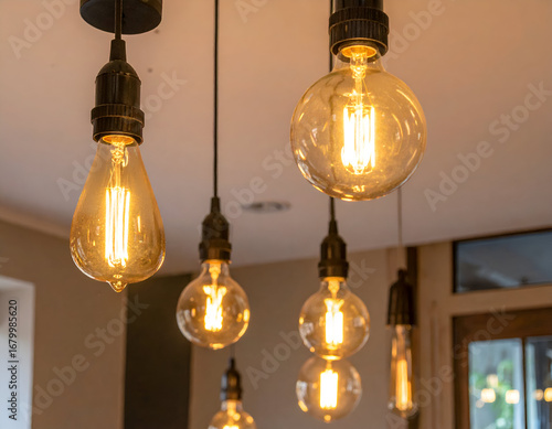 Warm glowing vintage Edison-style filament light bulbs hanging from the ceiling, creating a cozy and inviting ambient atmosphere.