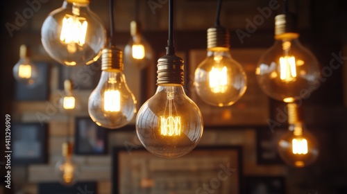 Warm Glowing Vintage Light Bulbs Hanging in Rustic Café Setting