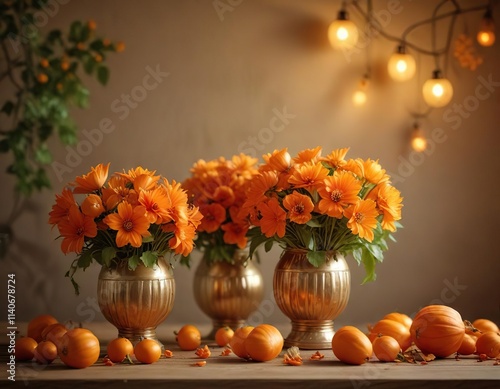 warm golden light falls on a still life of orange lanterns made of physalis and dahlia, warmth, orange