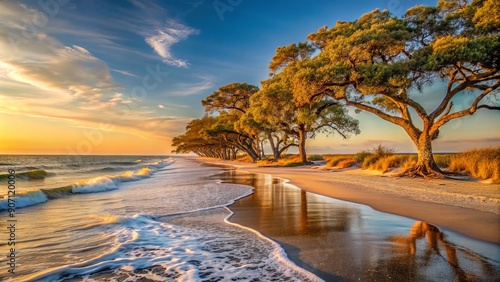 Warm golden light illuminates the tranquil shore of Oak Island, North Carolina, with gentle waves caressing the sugar-white sand and majestic oak trees standing tall.