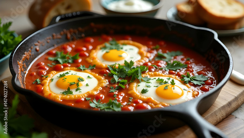 egg, frying pan, cast iron, tomatoes, sauce, parsley, dish, food, cookery, breakfast, lunch, dinner, meal, homemade, cooking, healthy, delicious, fresh, rustic, vibrant, aromatic, traditional, mediterranean, middle eastern, vegetarian, poached, herb, vegetable, tomatoes, comfort food, epicure, culinary, tasty, appetising, presentation, closeup, mealtime, nourishment, brunch