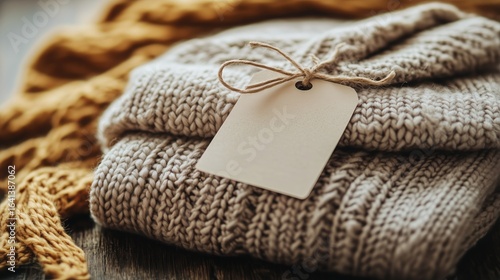 Warm Knitted Sweaters Stacked Neatly With a Blank Tag for Labeling in a Cozy Setting.