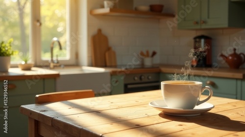 Warm Morning Sunlight Illuminates a Steaming Cup of Tea on Rustic Kitchen Table