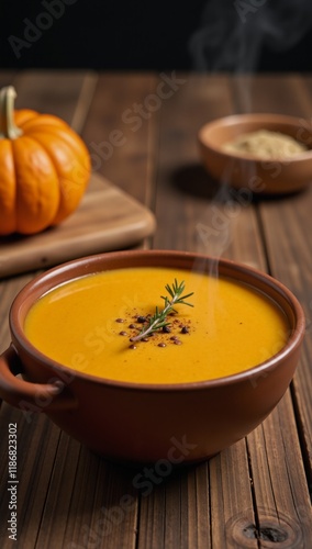 pumpkin soup, warm, comfort food, autumn, fall, cosy, seasonal, steaming, hot, hearty, bowl, rustic, wooden, table, kitchen, dining, homestyle, homemade, flavorful, spicey, pepper, thyme, herb, aromatic, savoury, epicure, dish, appetising, enticing, inviting, seasoning, farmhouse, country