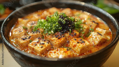 Warm Steaming Bowl of Spicy Tofu Soup Garnished with Fresh Green Onions