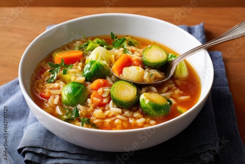 soup, vegetable, brussels, sprout, rice, winter, meal, warm, comforting, alimentary, healthy, food, lunch, dinner, carrot, parsley, fresh, bowl, serving, eating, hot, cooked, homemade, cookery, vegetarian, diet, broth, seasonal, autumn, cosy, hearty, delicious, starter, culinary, gastronomy, receipe, table, wood, background, close, up, spoon, ingredient, rustic