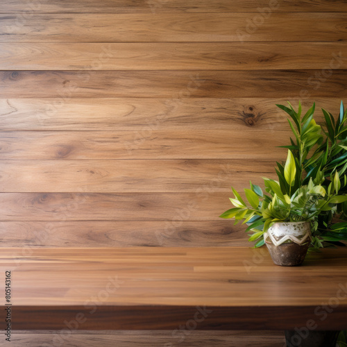 Warm wooden texture with a potted plant on a reflective surface, ideal for backgrounds