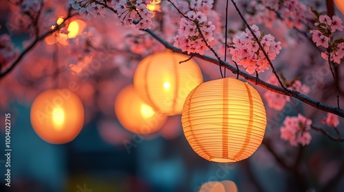 Warm yellow lanterns and pink cherry blossoms under a magical dusk, creating a serene and picturesque setting.