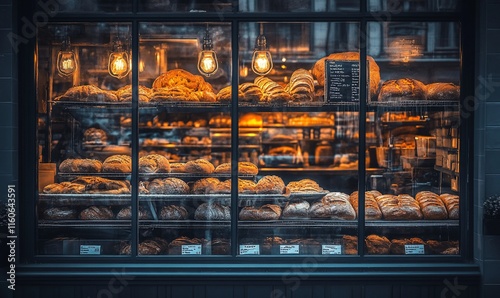 bakery, bread, loaf, shop, window, display, food, delicious, baked, warm, light, gold, crusty, oven, fresh, aroma, pastry, wheat, flour, grain, carb, tasty, appetising, eatery, cafes, store, retail, commercial, product, sale, market, rustic, vintage, interior, shelf, shelf, arrangement, presentation, illumination, night, evening, dark, brown, texture, background