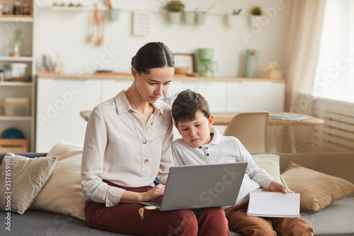 Warm-toned portrait of elegant young mother and son using laptop while studying at home in cozy interior, copy space