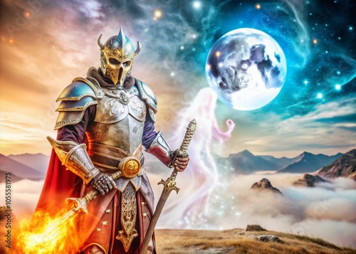 warrior, night, panoramic, mystical, aethereal, landscape, armoring, starry sky, mist, mountain, moonlight, mystery, struggle, fantasy, adventure, battle, heroic, solitude, enchantment, magic, surreal, shadow, epic, cinematic, brave, ancient, mythical, horizon, dreamlike, celestial, twilight, power, darkness, legend, warrior, nature, art, journey, exploration, imagination