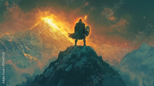 warrior, mountain, peak, sunset, victory, landscape, epic, fantasy, hero, soldier, shield, spear, brave, courageous, powerful, majestic, dramatic, gold, sky, cloud, snow, cold, winter, rugged, terrain, adventure, conquest, achievement, triumph, strong, determined, resolute, steadfast, lone, silhouette, shadow, climber, summit, highland, altitude, vista, view