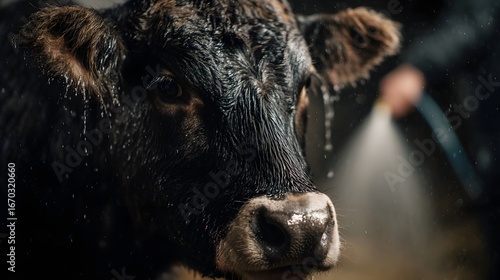 washing, cow, hose, care, animal, bovine, farm, agriculture, domestic, wet, water, nose, eye, fur, muzzle, grooming, cleaning, closeup, texture, rural, nature, dark, shadow, light, contrast, detail, maintenance, laundered, spray, rinse, dirt, mud, grime, hygiene, life, husbandry, agricultural, countryside, rustic, earthy, natural, organic, authentic, genuine, raw, intimate, sensory, intense