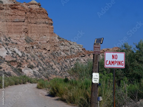 Washington County, Utah--July 2018: Red cliffs and rock formations with roadside signs to the Grafton ghost town, the most photographed ghost town near Zion National Park, Utah.