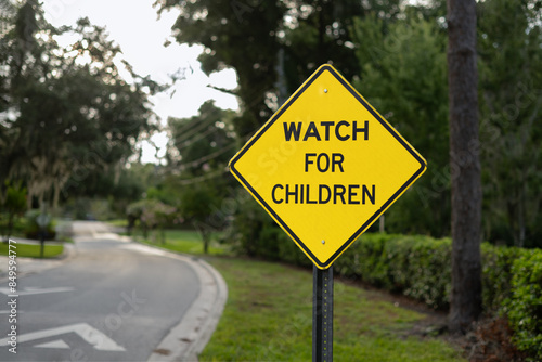 WATCH FOR CHILDREN, a yellow and black diamond sign surrounded by trees and a dirt road in the background.