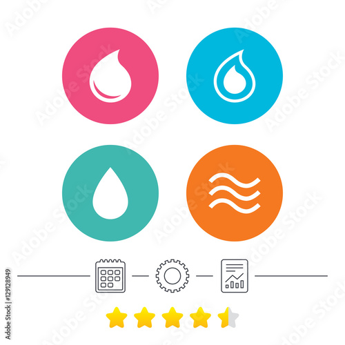 Water drop icons. Tear or Oil drop symbols. Calendar, cogwheel and report linear icons. Star vote ranking. Vector