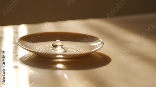 Water droplet refraction on a cream-colored plate under soft sunlight, creating reflections and patterns.
