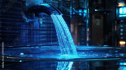 water, fountain, modern, interior, design, architecture, futuristic, technology, stainless, steel, blue, light, flow, stream, glasses, liquid, basin, decorative, abstract, contemporary, minimalism, minimal, clean, simple, geometric, shiny, wet, smooth, chrome, sparkling, bright, high-coloured, artificial, lighting, illuminated, night, urban, dark, background, wall, detail, closeup