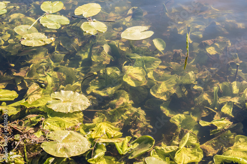 sunny, day, water, lily, leaf, lotus, top, leaf, duck pond, view, flower, green, background, beauty, nature, plant, beautiful, summer, natural, blossom, aquatic, texture, closeup, white, tropical, flora, lake, water lily, surface, season, floating