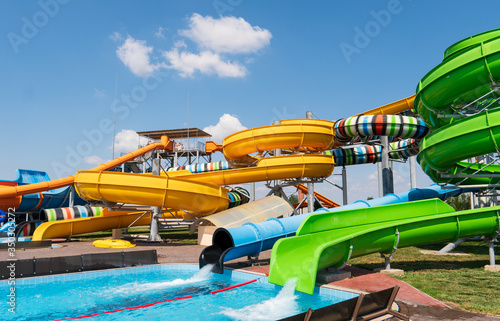 Water park with colorful slides and pools