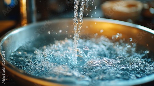 water, pouring, bowl, metal, sink, splash, bubble, liquid, clean, fresh, clear, flow, stream, kitchen, cooking, washing, rinsing, cleanliness, hygiene, texture, surface, domestic, household, home, interior, design, still, life, photo, image, photo, bright, shiny, chrome, movement, dynamic, closeup, detail, drop, fluid, transparent, cool, refreshing, wet, fill, basin, container