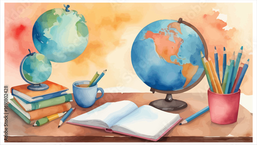 Watercolor art of globes books pencils and cup on a desk for education and learning