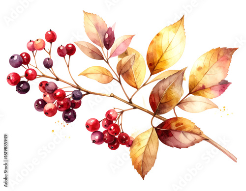 rowan, autumn, berry, leaf, fall, watercolor, tree branch, red, isolated, thanksgiving, seasonal, flora, plant, foliage, still life, art, botanical, nature, vibrant, hand-drawn, design element, clip art, artistic, artwork, image, illustration, drawing, creative, decoration, floral, natural, botany, beauty, season, harvest, freshness, elegance, style, delicate, warmth, cheerful, festive, joy