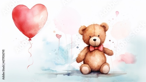 Watercolor bear with red bow tie seated near heart-shaped balloon and pastel tones splash decor