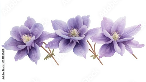 Watercolor botanical illustration of columbine plant with three purple flowers on a white background