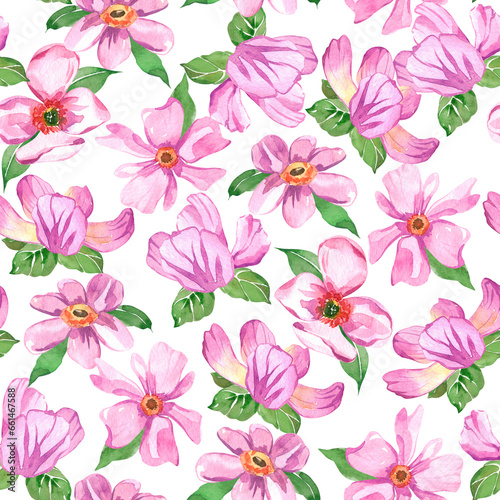 Watercolor botanical seamless pattern wild flowers and garden plants. Hand drawn leaves, pink flowers, herbs and natural elements. For decorations, scrapbooking, cards for birthday, party,baby shower.