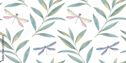 Watercolor butterflies, dragonflies, graceful twigs with leaves on an abstract background. Seamless botanical pattern for design.