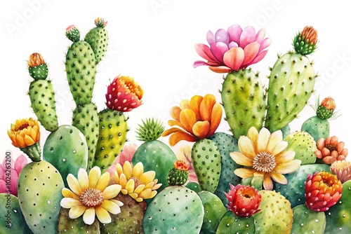 Watercolor cactuses with flowers Opuntia on white background in fisheye view