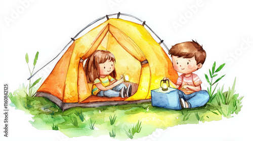 camping, children, tent, watercolor, night, lantern, grass, adventure, cosy, playful, nature, summer, fun, illustration, children, light, exploration, joy, family, friendship, scene, colourful, artistic, backyard