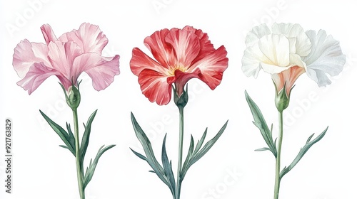 Watercolor carnation clipart in various colors, including pink, red, and white