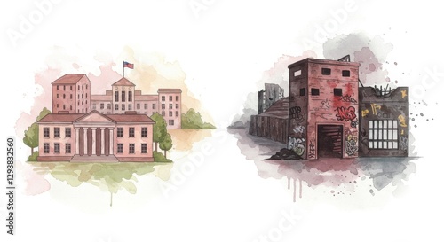 Watercolor Cartoon Illustration of Legal and Illegal Pathways Featuring Symbolic Buildings - This watercolor cartoon illustration contrasts lawful and unlawful pathways through buildings representing