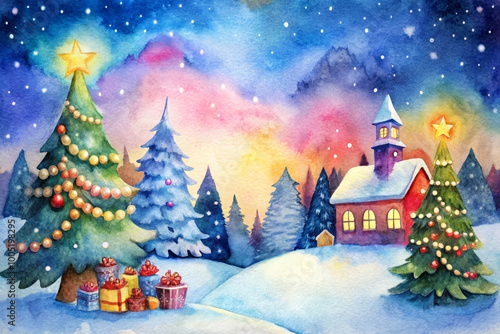 watercolor, christmas, scene, tree, gift, snow, winter, holiday, decoration, star, church, artistic, festive, landscape, cosy, glowing, blue, purple, orange, present, night time, celebration, nature, cheerful, bright, background, peaceful, design, colourful, card, magic, cute, childlike, fun, tranquil, serene, picturesque, beautiful, craft, season, joy, warmth, tradition, family, calmness